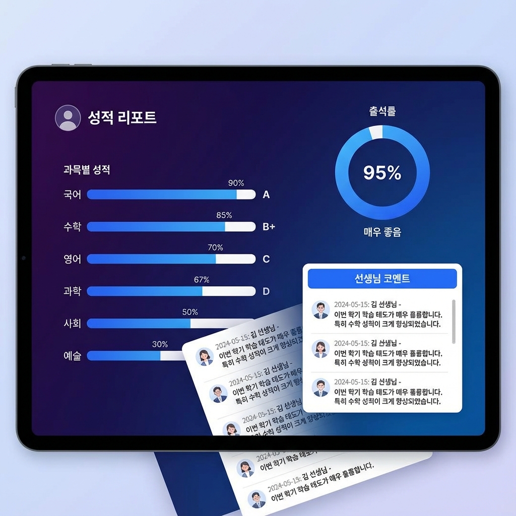 - 종합 성적 리포트: 과목별 성취도, 누적 등수, 출석률을 종합한 프리미엄 리포트를 생성합니다.